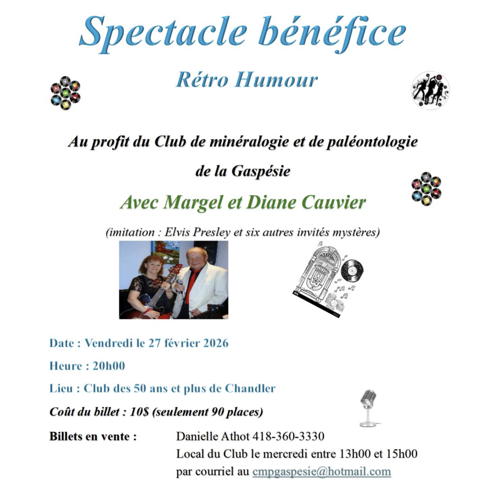 Au profit du Club de Minéralogie et de Paléontologie de la Gaspésie, avec Margel et Diane Cauvier. Date : Vendredi le 27 février 2026 Endroit : Au Club des 50 ans et plus de Chandler Heure : 20h00 Coût du billet : 10,00$ Billets en vente : Au local du Club le mercredi entre 13h00 et 15h00, auprès de madame […]