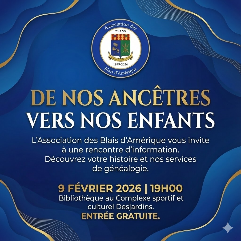 Activité organisée par Claude Blais. Vous êtes curieux de découvrir l’origine de votre nom, l’Association des Blais d’Amérique vous ouvre ses portes ! 📜 Nous vous invitons à une soirée d’échange et de découverte dédiée à notre patrimoine commun. Le président de l’Association sera sur place pour vous présenter nos services et vous aider à […]