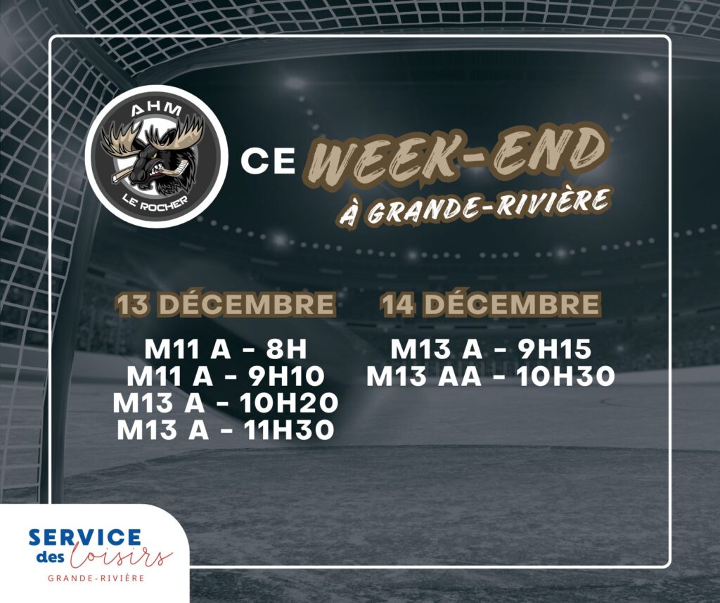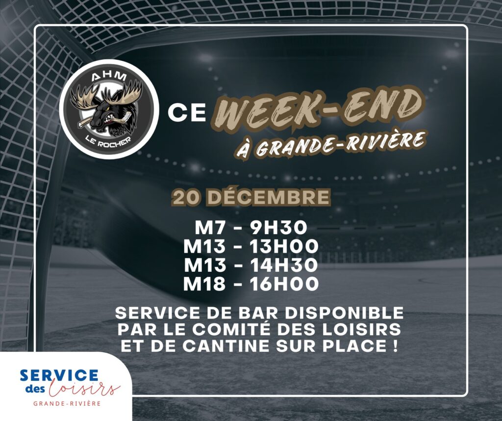 La Ville de Grande-Rivière et le Service des loisirs sont heureux d’accueillir plusieurs matchs de l’Association du hockey mineur du Rocher. Venez encourager nos jeunes athlètes et profiter de l’ambiance animée au Complexe sportif et culturel Desjardins. Horaire des matchs Services sur place Nous vous invitons à venir en grand nombre pour soutenir nos équipes […]