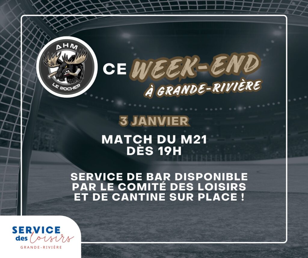 La Ville de Grande-Rivière et le Service des loisirs sLe Service des loisirs de Grande-Rivière vous invite à venir encourager nos athlètes lors du match du M21, présenté au Complexe sportif et culturel Desjardins. Match au programme Services offerts sur place Un beau moment sportif vous attend ! Joignez-vous à nous pour soutenir nos joueurs […]