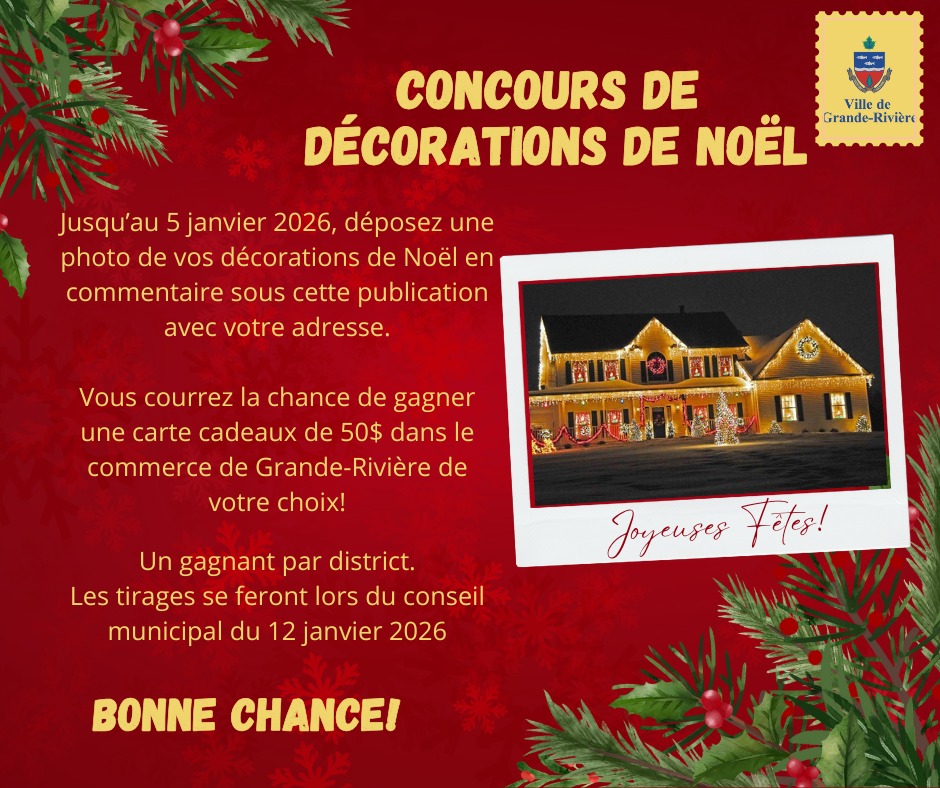 Jusqu’au 5 janvier 2026, déposez une photo de vos décorations de Noël en commentaire sous cette publication sur la page facebook de la Ville de Grande-Rivière avec votre adresse. Vous courrez la chance de gagner une carte cadeaux de 50$ dans le commerce de Grande-Rivière de votre choix! Un gagnant par district. Les tirages se […]