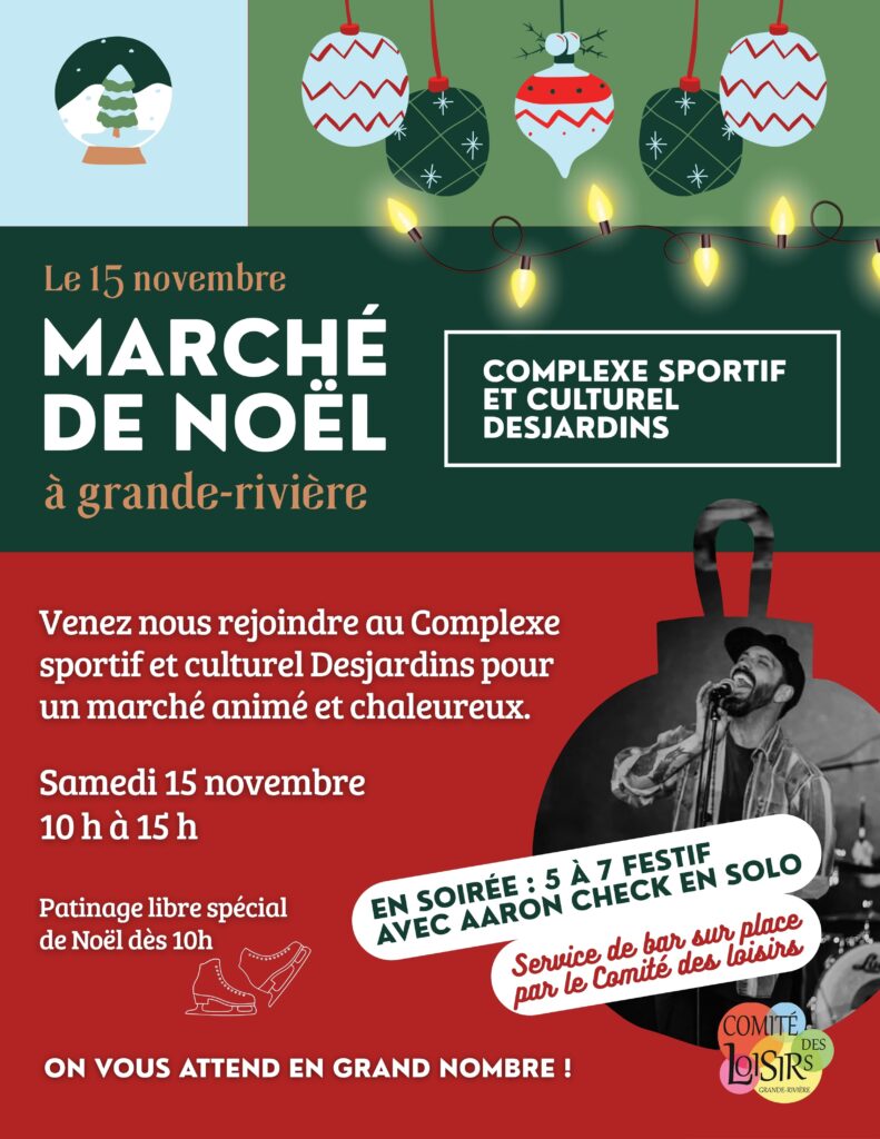 La magie des Fêtes s’installe à Grande-Rivière ! Venez vivre un moment chaleureux et festif au Complexe sportif et culturel Desjardins. 📅 Samedi 15 novembre 2025🕙 10 h à 15 h – Marché de Noël animé et convivial⛸️ Patinage libre spécial de Noël dès 10 h🎶 En soirée : 5 à 7 festif avec Aaron […]